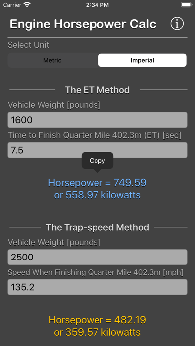 Engine Horsepower Calculator are used to estimate the engine horsepower of your vehicle based on the weight, the time, and the speed to finish a quarter mile run. The weight to be used should include the mass of the vehicle, the driver, the passenger, and other load. The results of these calculator are estimations only. Horsepower Calculation Method The ET Method This method uses the vehicle weight and the elapsed time (ET) to finish a quarter mile (402.3 meters). The Trap-speed Method This method uses the vehicle weight and the speed at which the vehicle finished a quarter mile (402.3 meters) . The speed to be used here should be the finishing speed at the quarter mile point. The RPM Torque Method This method uses the torque value from the vehicle manual book, The RPM should indicate the maximum torque output. Thanks for your support and do visit nitrio.com for more apps for your iOS devices.
