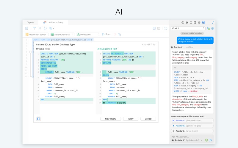 Navicat Premium is a robust, all-in-one solution for database development that enables seamless connections to multiple databases, including MySQL, PostgreSQL, MongoDB, MariaDB, SQL Server, Oracle, SQLite, Redis, and Snowflake, all from a single application. Its native user interface delivers a streamlined experience, making database design, management, and maintenance easier than ever. Whether you're executing complex queries, performing data migrations, aligning data models with databases, or leveraging powerful business intelligence tools for insightful analysis, Navicat Premium provides the essential tools for optimal database performance and increased productivity. Data Viewer View, update, and delete records in Grid View or Form View with our built-in editors. Integrate a data profiling tool for visual data analysis and interact with charts for deeper insights. Object Designer Manage database objects through a responsive interface that simplifies query writing into structured tabs, enabling more confident and accurate complex queries. Query Edit Accelerate your coding process with Code Completion and Code Snippet, and gain valuable insights into query-database interaction by visualizing the execution plan. You can also visually construct queries using a set of interactive tools. AI Assistant Ask questions for instant answers and enhance your queries by providing context about your database or schema. The AI Assistant provides relevant information based on your structure, and you can even compare answers from different AI models. Ask AI Customize and pin your favorite AI actions for instant workflow optimization. It includes built-in tools to explain, tune, and format SQL, plus instant suggestions to fix errors, improving code quality. Migration Data Transfer, Data Synchronization, and Structure Synchronization streamline data migration with reduced overhead. They offer step-by-step guidelines for transferring data between databases, enabling quick comparisons and synchronizations, along with detailed scripts that outline your desired changes. Model Convert your databases into graphical representations and build multiple models in a single workspace using Relational, Dimensional, and Data Vault 2.0 methods. Align your designs with the actual database to ensure model integrity and enhance navigation and understanding of complex systems. BI Visualize large data sets to uncover patterns and trends, and present your findings in an interactive dashboard. In this dashboard, all charts are interconnected, so actions on one chart instantly update others. Import and Export Import data from various formats or ODBC, and export data from tables, collections, views, or query results to popular formats like Excel, Access, and CSV. Data Generator Generate a wide range of quality testing data quickly, creating realistic data sets with referential integrity based on business rules and constraints. Collaboration Sync your connection settings, queries, aggregation pipelines, snippets, model workspaces, BI workspaces and virtual group information to the cloud service for real-time access and easy sharing with coworkers anytime, anywhere. Other useful features: - Data dictionary - Navicat URI - ER diagram view - Table and collection profile - Text, hex, image, web or BFile viewer and editor - Object filter - Query pinned result - SQL beautifier - Debugger for Oracle and PostgreSQL - Connection coloring - Virtual grouping - Backup and restore - Aggregation pipeline for MongoDB - Schema analysis for MongoDB - Tree View and JSON View for MongoDB - Pub/Sub for Redis - Automation - User privilege manager - Server monitor - Command monitor - Focus mode - Dark mode Note: Try Navicat free for 14 days with full app access. Your trial will automatically convert to a paid subscription unless canceled 24 hours before it ends. Terms of Use: https://www.navicat.com/manual/online_manual/en/navicat_17/mac_manual/#/license_agree