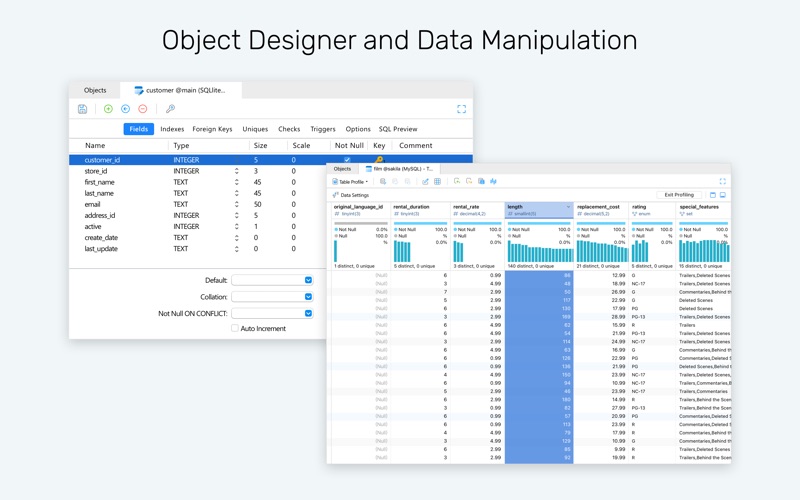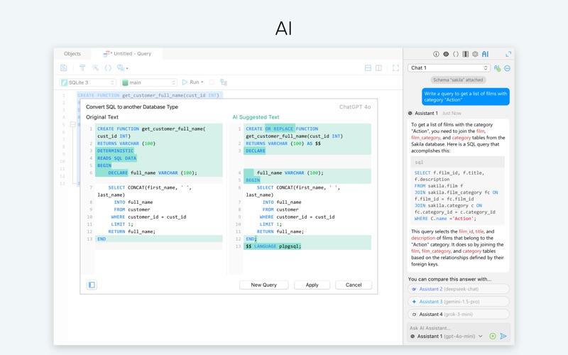 Navicat for SQLite is an exceptional and comprehensive GUI tool that provides a complete set of functions for easy navigation and customization. Its powerful query editor includes syntax highlighting and code completion, while its flexible import and export options significantly streamline the data manipulation process. You can also visually design and manage database structures, and engage our built-in BI tools to facilitate insightful data analysis and reporting. Data Viewer View, update, and delete records in Grid View or Form View with our built-in editors. Integrate a data profiling tool for visual data analysis and interact with charts for deeper insights. Object Designer Manage database objects through a responsive interface that simplifies query writing into structured tabs, enabling more confident and accurate complex queries. Query Edit Accelerate your coding process with Code Completion and Code Snippet, and gain valuable insights into query-database interaction by visualizing the execution plan. You can also visually construct queries using a set of interactive tools. AI Assistant Ask questions for instant answers and enhance your queries by providing context about your database or schema. The AI Assistant provides relevant information based on your structure, and you can even compare answers from different AI models. Ask AI Customize and pin your favorite AI actions for instant workflow optimization. It includes built-in tools to explain, tune, and format SQL, plus instant suggestions to fix errors, improving code quality. Migration Data Transfer and Data Synchronization streamline data migration with reduced overhead. They offer step-by-step guidelines for transferring data between databases, enabling quick comparisons and synchronizations, along with detailed scripts that outline your desired changes. Model Convert your databases into graphical representations and build multiple models in a single workspace using Relational, Dimensional, and Data Vault 2.0 methods. Align your designs with the actual database to ensure model integrity and enhance navigation and understanding of complex systems. BI Visualize large data sets to uncover patterns and trends, and present your findings in an interactive dashboard. In this dashboard, all charts are interconnected, so actions on one chart instantly update others. Import and Export Import data from various formats or ODBC, and export data from tables, collections, views, or query results to popular formats like Excel, Access, and CSV. Data Generator Generate a wide range of quality testing data quickly, creating realistic data sets with referential integrity based on business rules and constraints. Collaboration Sync your connection settings, queries, snippets, model workspaces, BI workspaces and virtual group information to the cloud service for real-time access and easy sharing with coworkers anytime, anywhere. Other useful features: - Data dictionary - Navicat URI - ER diagram view - Table profile - Text, hex, image or web viewer and editor - Object filter - Query pinned result - SQL beautifier - Connection coloring - Virtual grouping - Backup and restore - Automation - User privilege manager - Server monitor - Focus mode - Dark mode Note: Try Navicat free for 14 days with full app access. Your trial will automatically convert to a paid subscription unless canceled 24 hours before it ends. Terms of Use: https://www.navicat.com/manual/online_manual/en/navicat_17/mac_manual/#/license_agree
