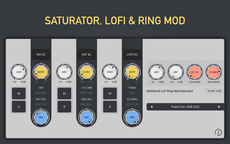 • 3-Band multi effects processor • Each band provides its own effect with mix blending control • Comes with built-in effects: Saturator, Lofi and Ring Modulator • Extendable via In-App purchase in Bandit store: Delay and Reverb • Frequency isolator equaliser (DJ style filter) • Two adjustable crossover points for low and high bands with slope up to 48dB • Separate Dry/Wet output controls • Suitable for any situation, going from subtle to drastic change • Multi-outs support, route each band to separate channels in your DAW • Advanced Responsive Design, portrait and landscape views FAC Bandit is a multiband audio effect that splits the audio signal into three bands of frequencies according two adjustable crossover points. Each band is processed independently by its own effect processor and the outputs are then recombined to produce the final effect. Each frequency range is altered with different effects and settings that won't sound the same if applied to the full frequency range. As you have probably realized, FAC Bandit is a wonderful and powerful sound design tool for designers who want to sculpt new personal, exciting and outstanding sounds. Either in a subtle way, without compromising the original tone, or in a more drastic way. - AuV3 and Standalone App - To use multiple outputs, you need a host able to provide additional output busses to the AuV3 plug-in The documentation is available at fredantoncorvest.com/FAC_Bandit.html